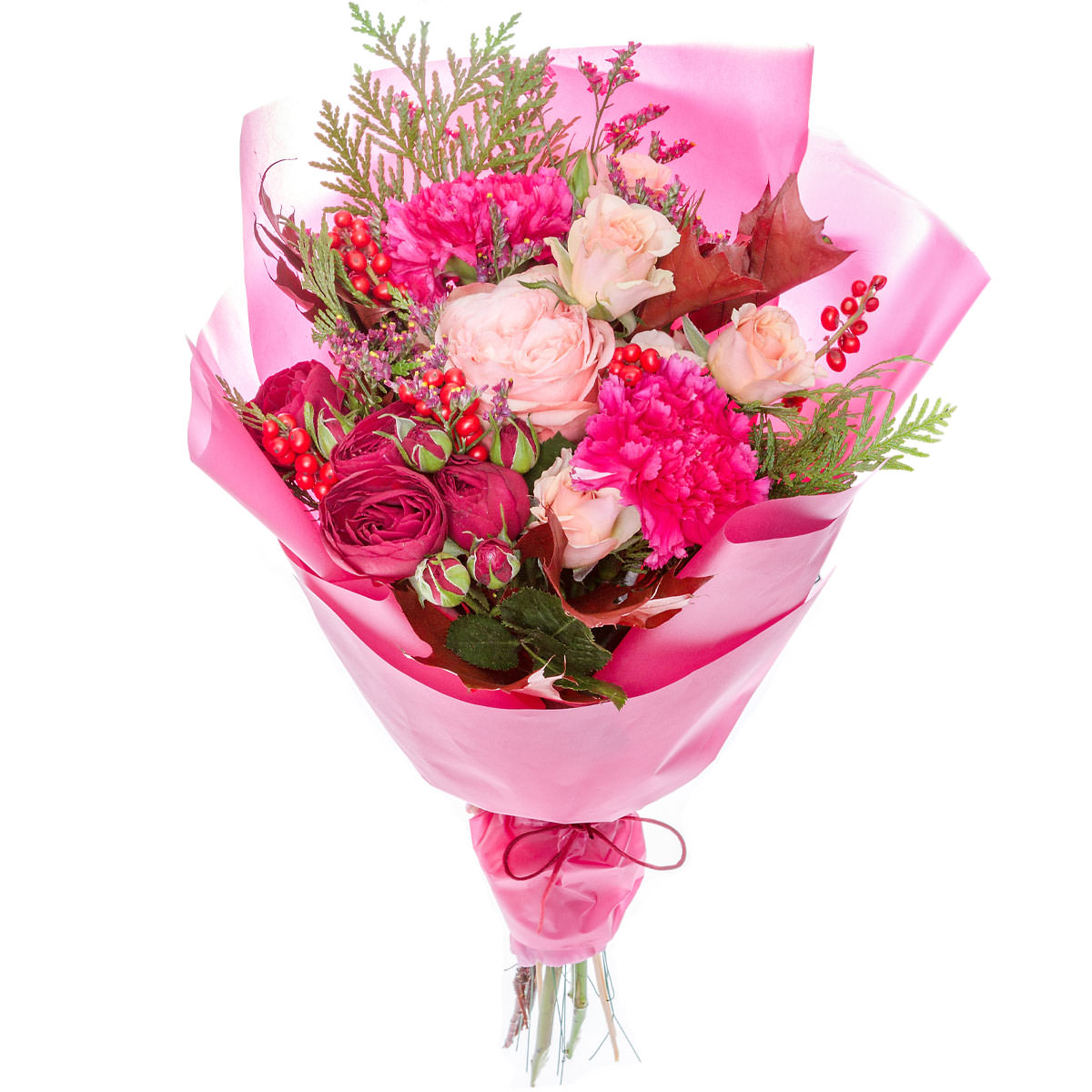 Роза кустовая, роза кустовая пионовидная, хризантема розовая, илекс, туя. Упаковка (лента, пленка, крафт, сетка, пленка матовая)