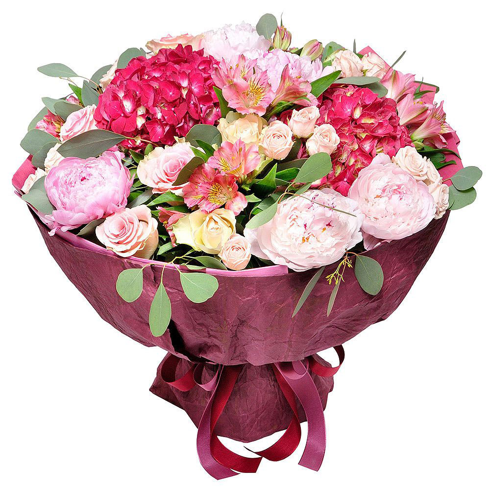 | Состав | Альстромерии, Гортензии, Кустовые розы, Пионы, Розы, Эвкалипт |