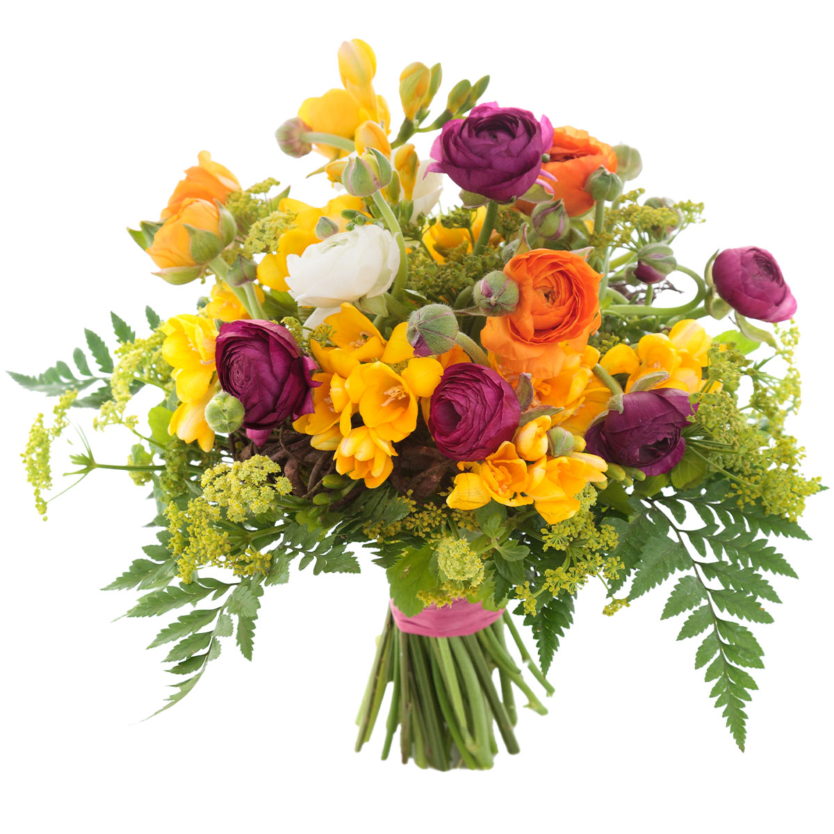 Ранункулюс оранжевый и сиреневый, фрезия желтая, папоротник, фенхель. Упаковка (лента, пленка, крафт, сетка, пленка матовая)