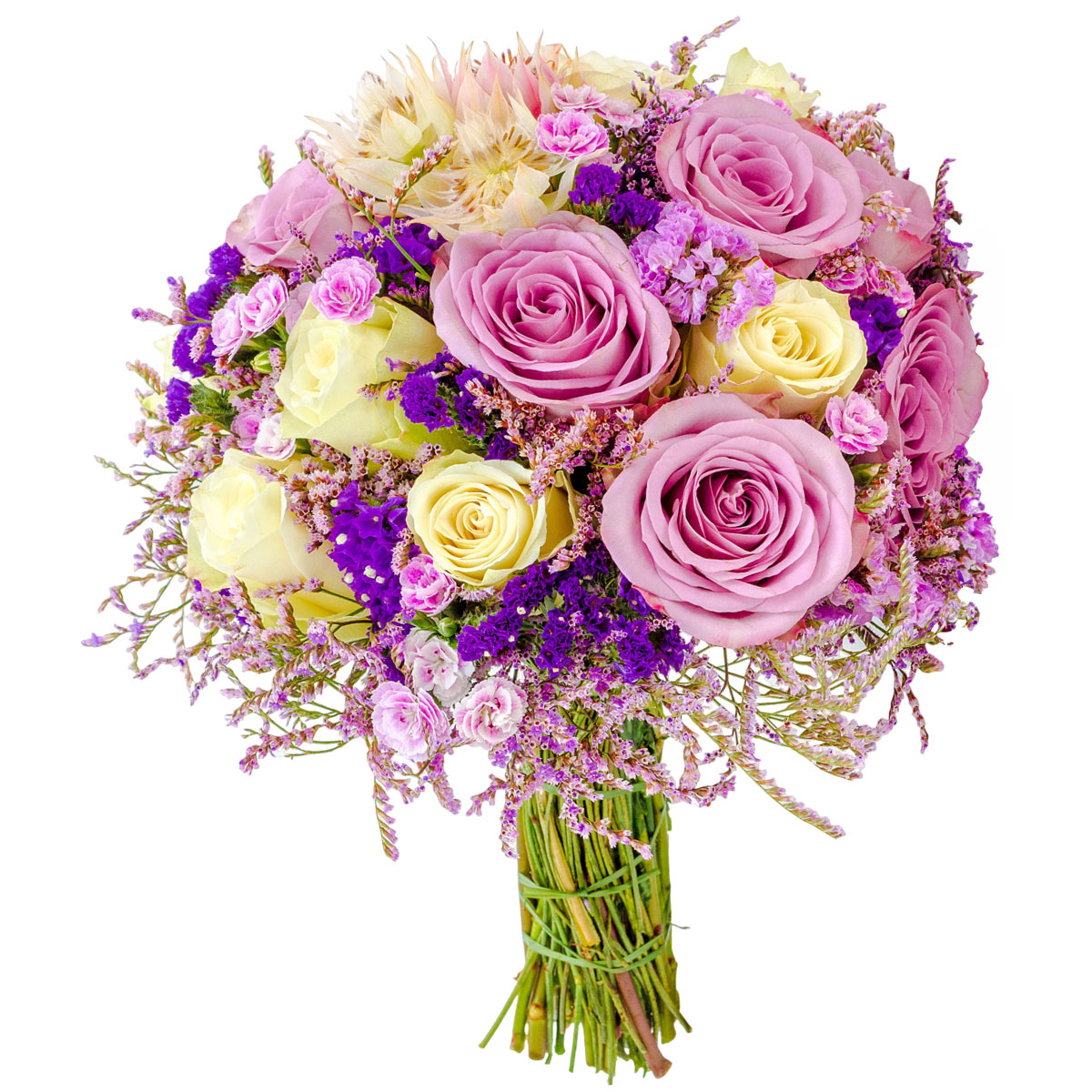 Роза одноголовая сиреневая и белая, хризантема мини кустовая сиреневая, статица фиолетовая и розовая, серрурия. Упаковка (лента, пленка, крафт, сетка, пленка матовая)