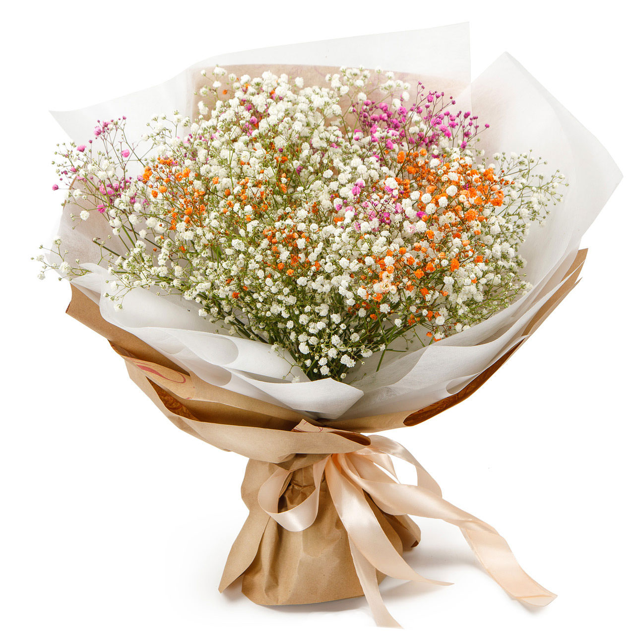 Гипсофила белая, оранжевая, розовая. Упаковка (лента, пленка, крафт, сетка, пленка матовая)
