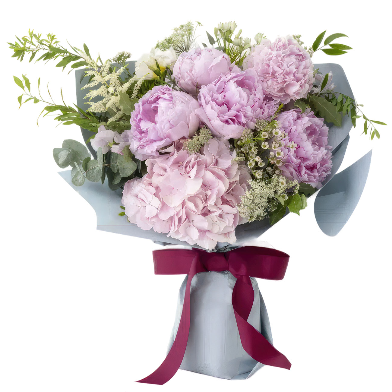 | Состав | Гортензии, Пионы, Эвкалипт, Эустомы |