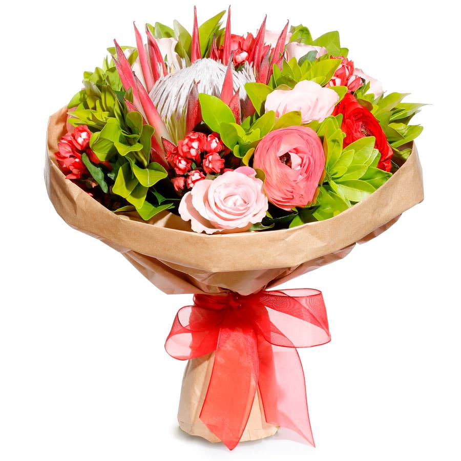 Роза одноголовая розовая, ранункулюс розовый, протея, рускус. Упаковка (лента, пленка, крафт, сетка, пленка матовая)