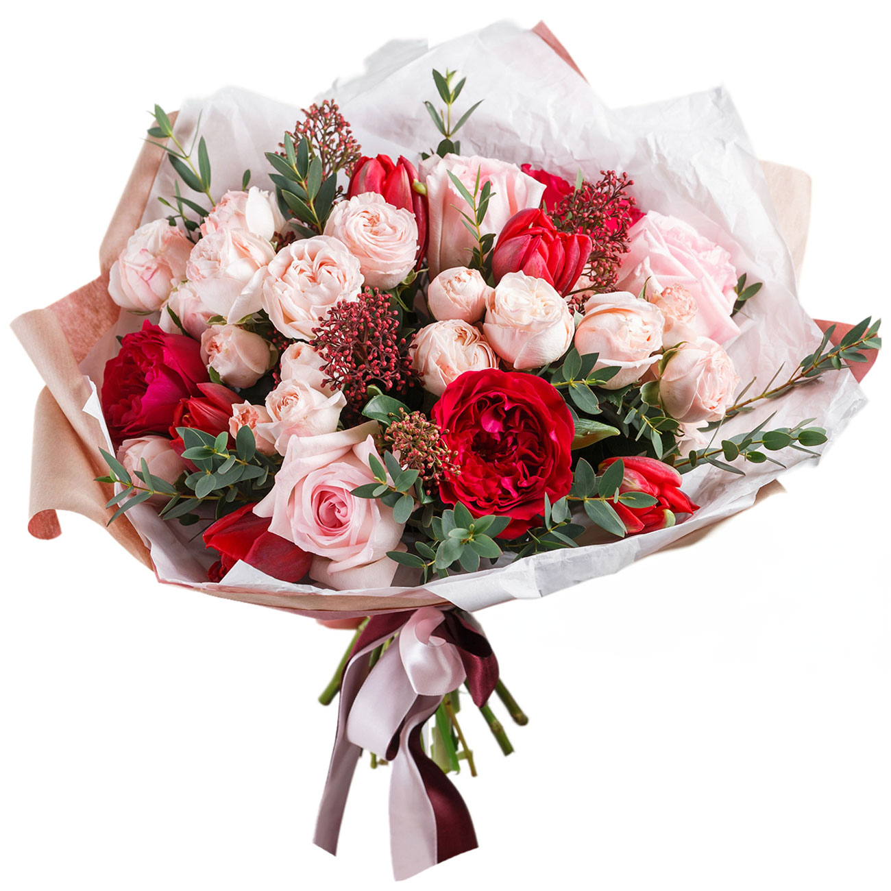 Роза пионовидная одноголовая красная, роза пионовидная кустовая нежно-розовая, тюльпан красный, скимия, эвкалипт. Упаковка (лента, пленка, крафт, сетка, пленка матовая)
