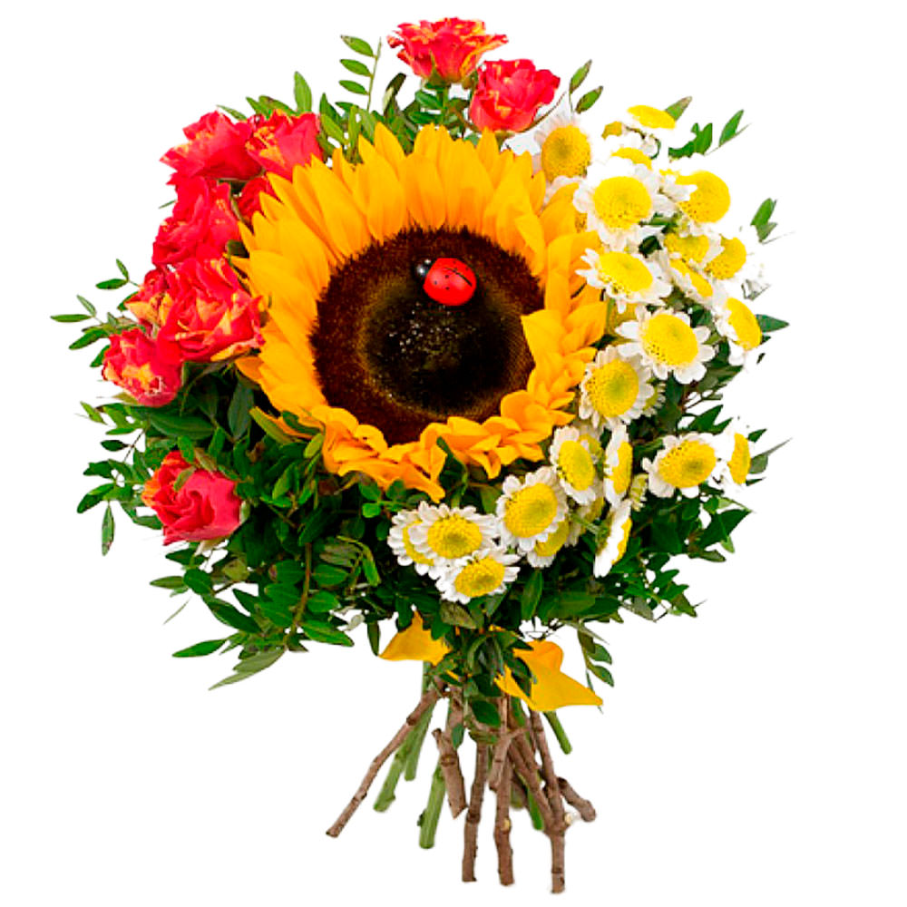 | Состав | Кустовые розы, Подсолнухи, Розы, Ромашки, Хризантемы |