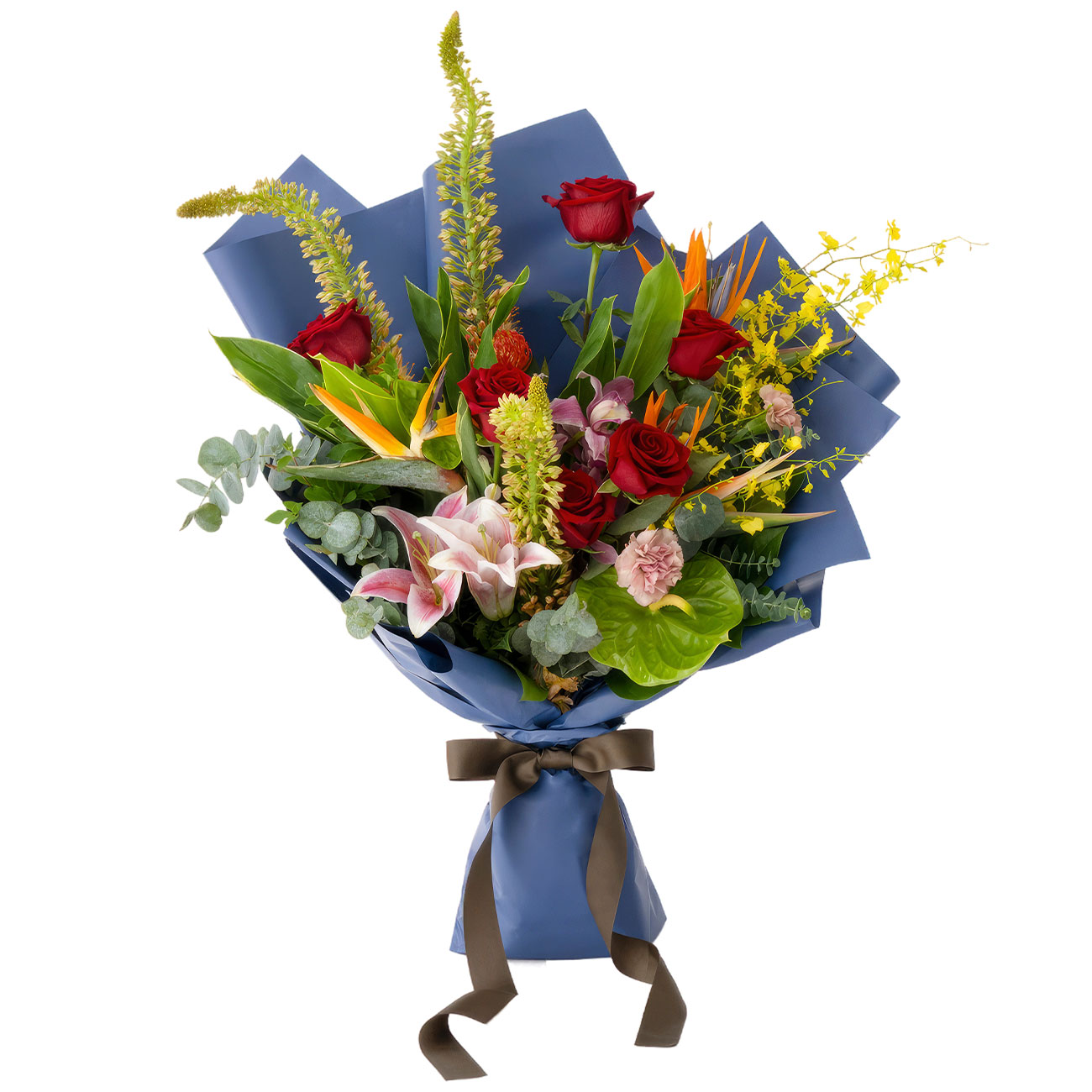 Роза кустовая бордовая, орхидея желтая голландская «Лисий хвост», стрелиция королевская, гвоздика кустовая мини розовая, антуриум зеленый, эвкалипт. Упаковка (лента, пленка, крафт, сетка, пленка матовая)