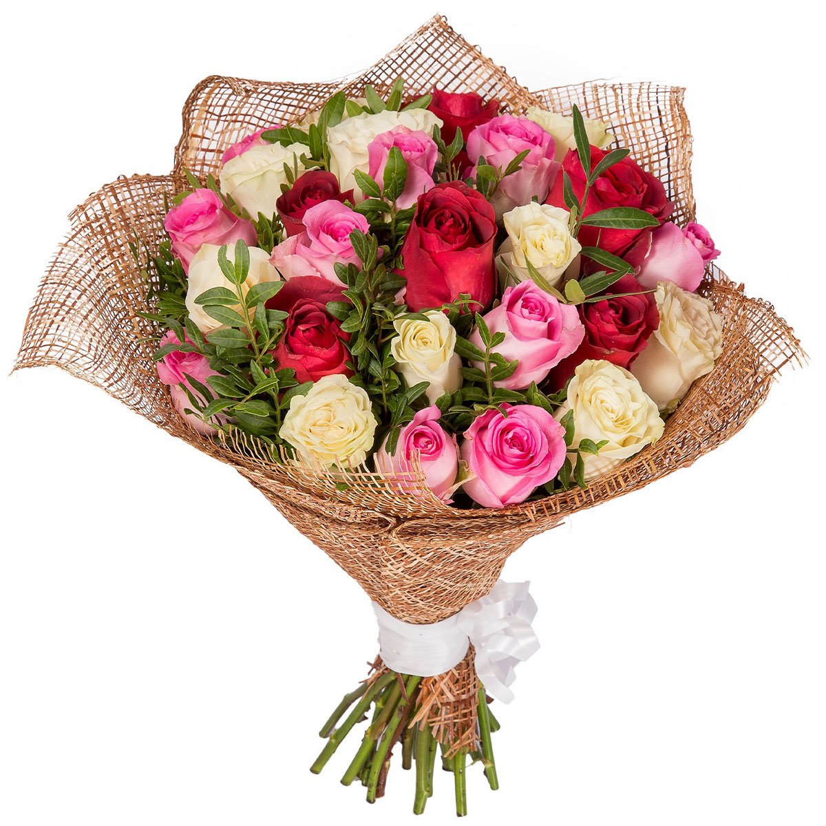 Роза одноголовая красная, розовая и кремовая, зелень. Упаковка (лента, пленка, крафт, сетка, пленка матовая)