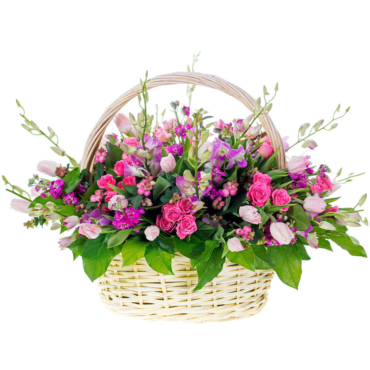 Роза кустовая розовая, тюльпан розовый, орхидея розовая, снежноягодник. Упаковка (Корзина, оазис, ящик).
