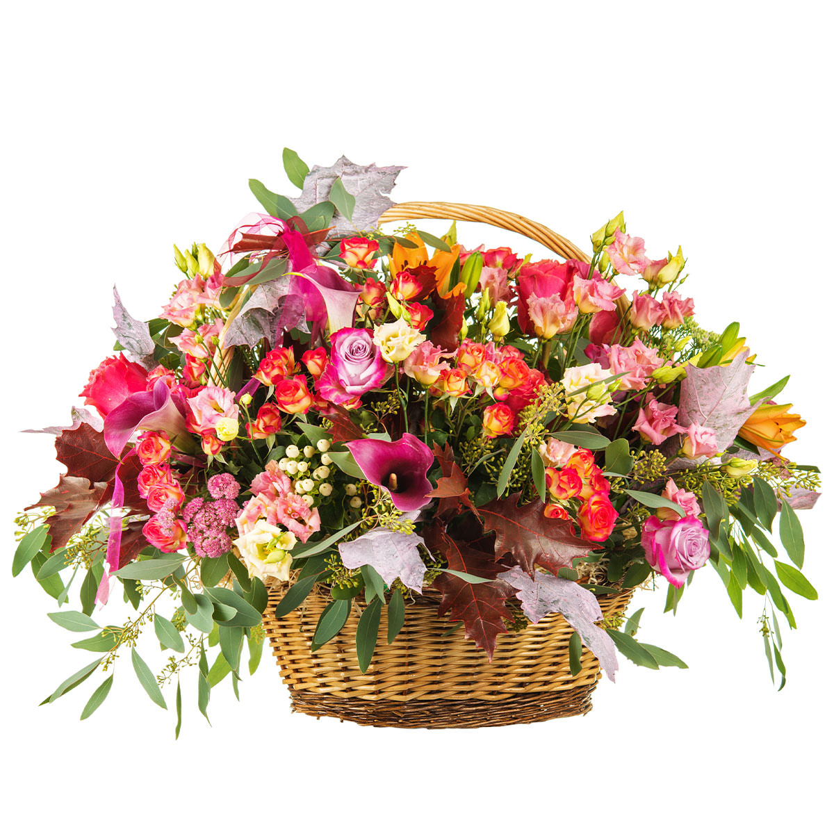 Калла розовая, роза кустовая красно-желтая, эустома розовая, кленовый лист, гиперикум, эвкалипт. Упаковка (Корзина, оазис, ящик).