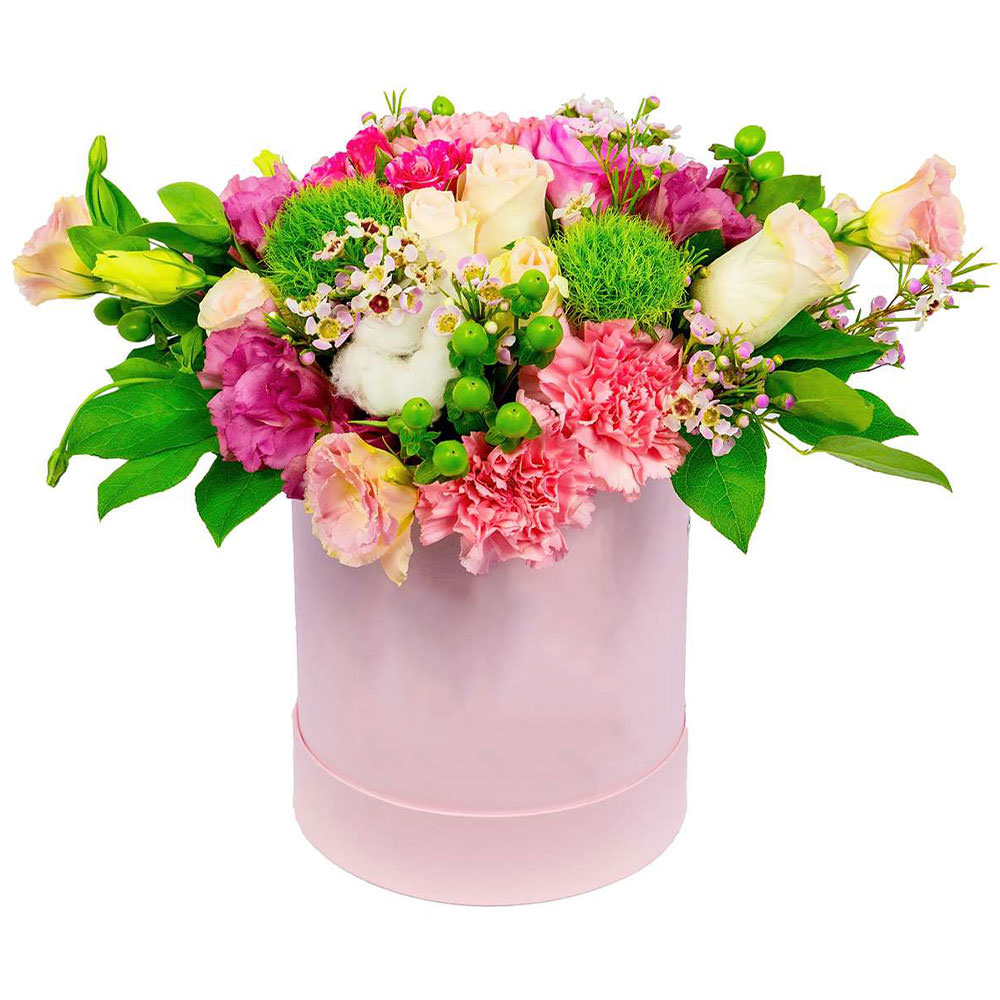 Гвоздика зелёная и малиновая, ваксфлауэр, эустома розовая, роза одноголовая кремовая, гипертекст, хлопок, зелень. Упаковка (шляпная коробка, квадратный бокс, коробка сердце, оазис)