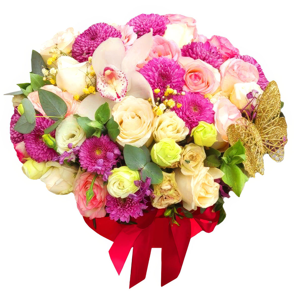 Орхидея белая, роза одноголовая кремовая, астра сиреневая, эустома бело-зеленая, гипсофила, эвкалипт, декоративная бабочка. Упаковка (шляпная коробка, квадратный бокс, коробка сердце, оазис)