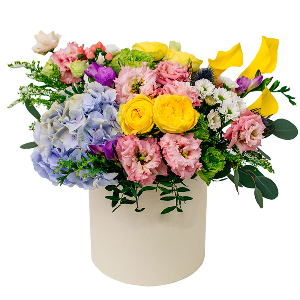 Гортензия голубая, роза пионовидная желтая, эустома розовая, калла желтая, фрезия фиолетовая, танацетум, фисташка, эвкалипт, солидаго, тласпи, гиперикум, эрингиум. Упаковка (шляпная коробка, квадратный бокс, коробка сердце, оазис)
