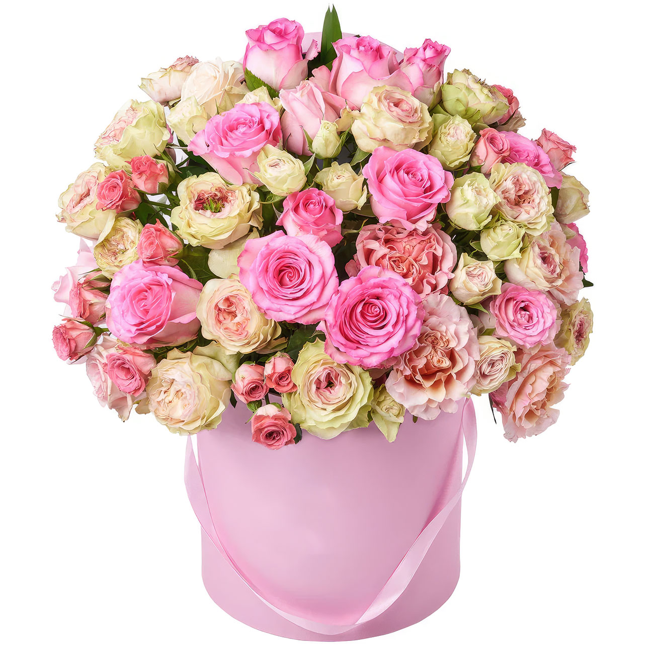 Роза одноголовая розовая, роза кустовая кремовая, роза пионовидная розовая. Упаковка (шляпная коробка, квадратный бокс, коробка сердце, оазис)