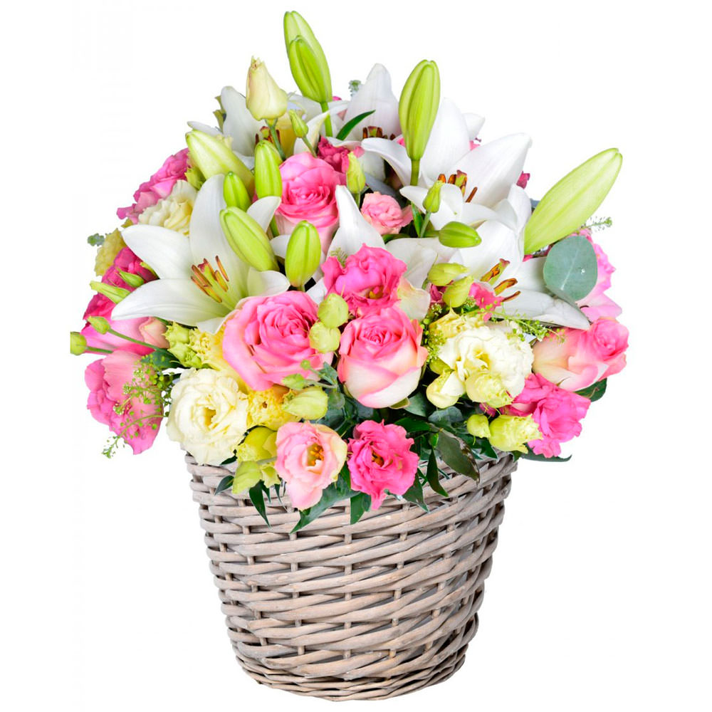Роза одноголовая розовая, эустома розовая и белая, лилия белая, эвкалипт. Упаковка (Корзина, оазис).